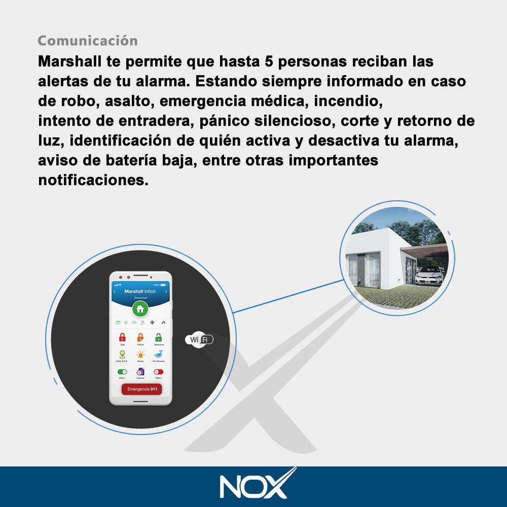 Manejá todo desde tu celular con la app gratuita Marshall Infinit (iOS y Android): activá o desactivá la alarma desde cualquier lugar, consultá el estado del sistema en tiempo real, llamá al 911 con un solo botón, dispará la sirena si detectás algo sospechoso, enviá alertas S.O.S. con ubicación vía WhatsApp, revisá el historial de eventos y automatizá luces, portones y dispositivos electrónicos. La configuración es simple y guiada por voz mediante asistente virtual.